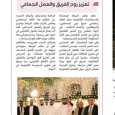 The Al-Riyada Law Firm and Legal Consulting organized a Ramadan Iftar gathering that brought together lawyers, employees, and members of the office in an atmosphere that reflects the spirit of the holy month and strengthens the bonds of communication between individuals in the legal and community sectors.